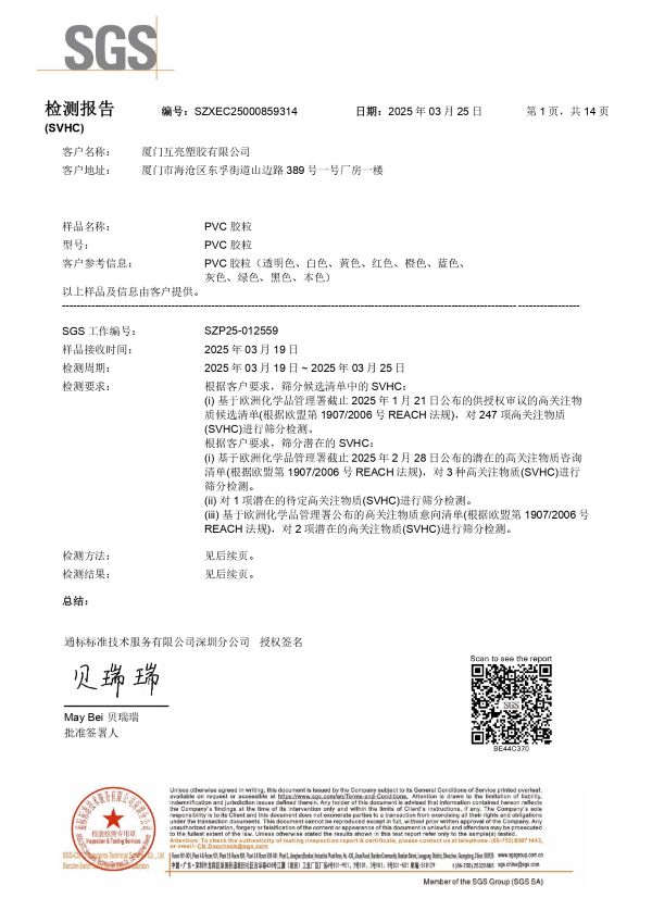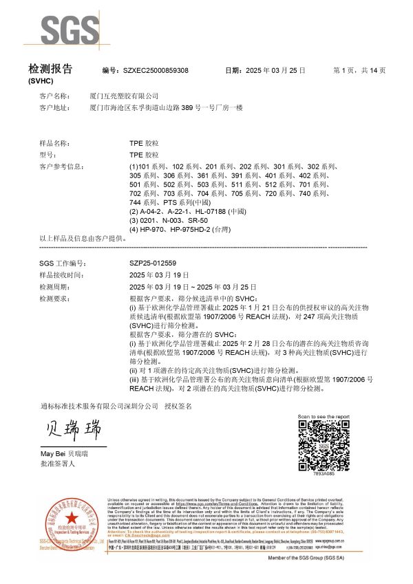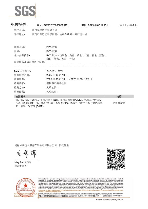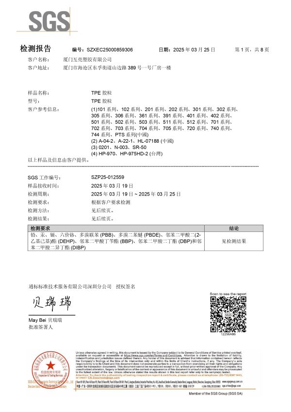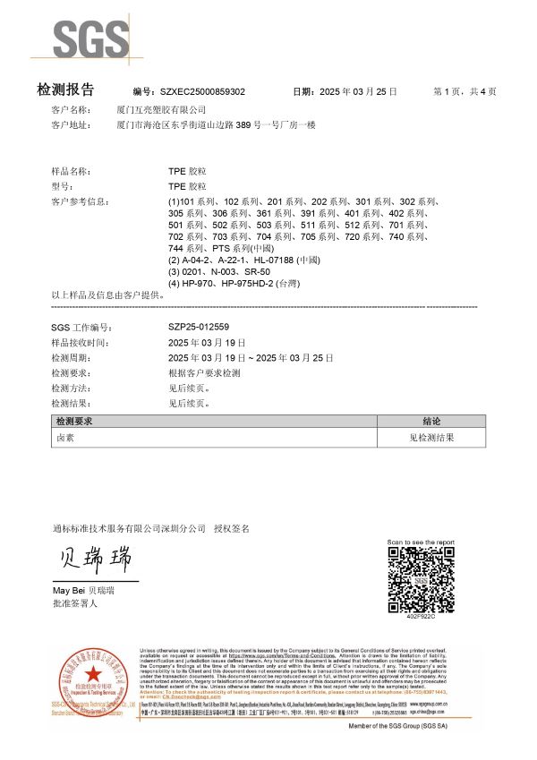 所有认证均由国际权威机构 SGS 出具,报告内容涵盖样品描述、检测项目、结果判定与验证编号,确保信息真实可靠。
